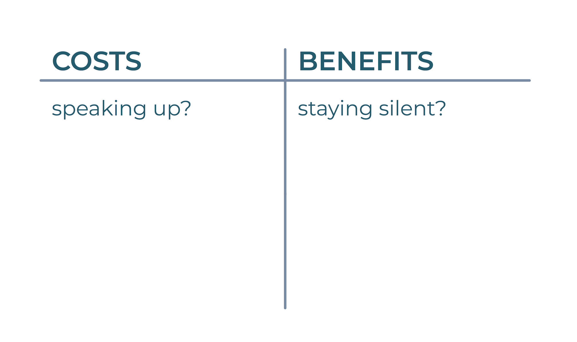 Hi Reader, As humans, we're incredibly attune to how costly speaking up can be. If the cost of sharing our perspectives, insights, expertise, or ourselves is too high, then it makes sense that we wouldn't want to incur those costs. But what if we’re making these choices to speak up or stay silent based on incomplete analysis? I don’t know about you, but I don’t typically sit around and do a slow pro/con evaluation. The calculation of whether to speak up is typically split-second and often unconscious. And unfortunately, flawed. When deciding whether or not to speak up, our brains focus on the SHORT-TERM: 1) What are the costs of speaking up? I have to take the time to figure out what I want to say. I have to face the discomfort. My palms will get sweaty. I need to deal with the other person's defensiveness or blowback now, and frankly, I just don't have the time or energy. 2) What are the benefits of silence? If I choose to stay silent, I don't have to deal with it right now. The other person might continue to see me as a valuable partner rather than someone trying to block their agenda. It will prevent me from being scathed. At least for now. Our analysis looks like this: These costs and benefits are rational, but they're also incomplete. What's missing from this analysis are the LONGER TERM costs. We can surface those by asking and answering 2 other equally important questions. 1) What are the costs of staying silent? Well, typically, things don't get better by themselves. If we don't say anything, there's no chance for repair or to course correct. Other people may not know that there's something going on. Leaders are left with a skewed data set. 2) What are benefits of speaking up? That we remember we have agency. That we have the opportunity to contribute. That even if other people don't choose to hear us, at least we know that we've done what we can and we live without regrets. And another benefit of speaking up: Things might actually change. There is actually the opportunity for repair or to course-correct. As you're figuring out whether it makes sense for you to speak up, don't forget to factor in the costs of staying silent and the benefits of speaking up. You can map out these four quadrants to get a more accurate sense of what's really at stake. At the end of the day, the choice of whether to speak up or stay silent in a meeting or in a relationship is yours. Only you know what you're carrying, what you're navigating, and what you're up against. But don't make that choice based on a flawed analysis. To building a life you want to live, Elaine When you’re ready, here are three ways I can help…